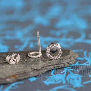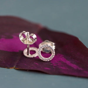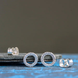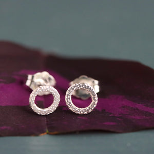 These simple and classic little open circle studs are a timeless style made unique by the addition of a subtle and dainty sparkle texture.