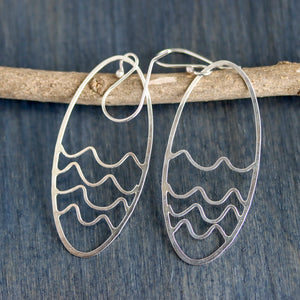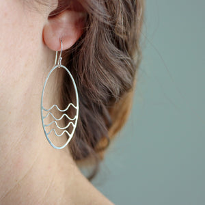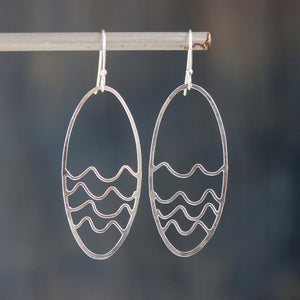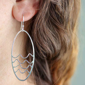 These nature inspired hammered wire earrings have an open oval shape with a layers of rippling water silhouetted at the bottom curve of the oval. They are elegant and striking, making them a great piece for work that can also easily transition from day to night. These earrings are light as a feather, making them perfect for all the adventures of the outdoor enthusiast, the wanderer, or the explorer at heart.