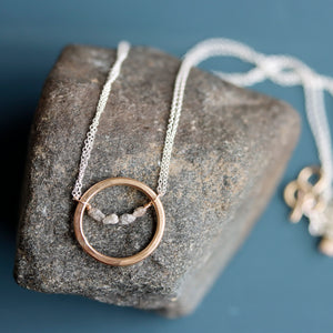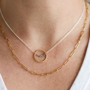 This necklace features an open hammered circle with a line of rough cut grey diamonds through the center, strung on a delicate and sparkly double chain.