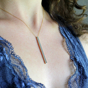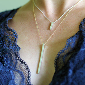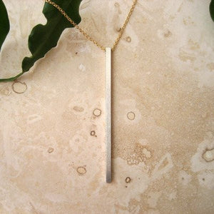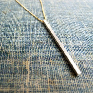 The solid sterling silver bar measures 2 inches from top to bottom. This piece comes on either sterling silver or 14k gold fill chain which slides smoothly through a carefully drilled hole at the top of the bar.