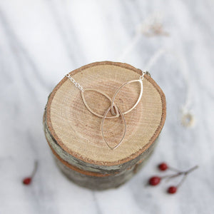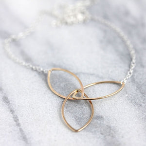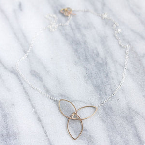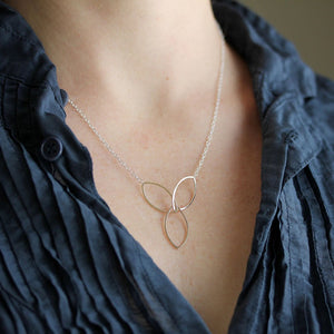 This simple geometric necklace features three interlocking ellipses on a delicate chain. The way the delicate shapes come together creates the look of a simple flower made of three petals. It is a great everyday piece, can be easily layered with other necklaces, and makes a sure to please gift!