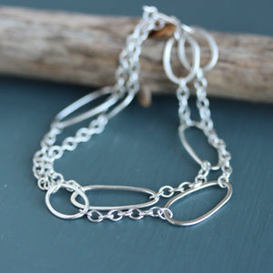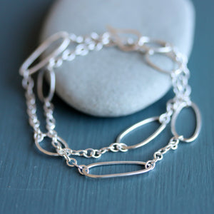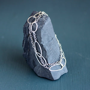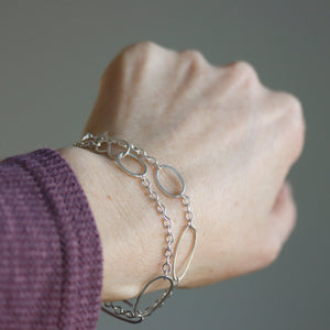 This sculptural wrap bracelet is built on a sturdy chain and is ready to stick with you on all of your adventures, whether they take you to a gallery opening or a 10 mile hike. Great for layering or on its own, it features organic hammered oval shapes that wind twice around your wrist and then fastens securely with a hand forged hook and eye clasp.