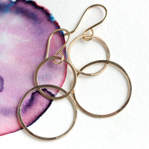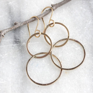 These simple and classic geometric earrings have two linked hammered open circle shapes on french wire hooks. They have great movement and sparkle, which makes them more eye catching and noticeable than your average small earrings, yet they are still understated enough to be appropriate for all settings. They are simple yet striking, making them a great piece for work that can easily transition from day to night.